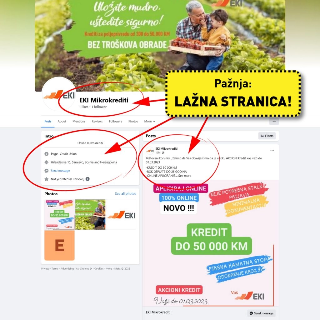 We would like to inform you that a fake page named "EKI Mikrokrediti" has appeared on Facebook. This page has only one post offering a loan that does not comply with EKI terms.