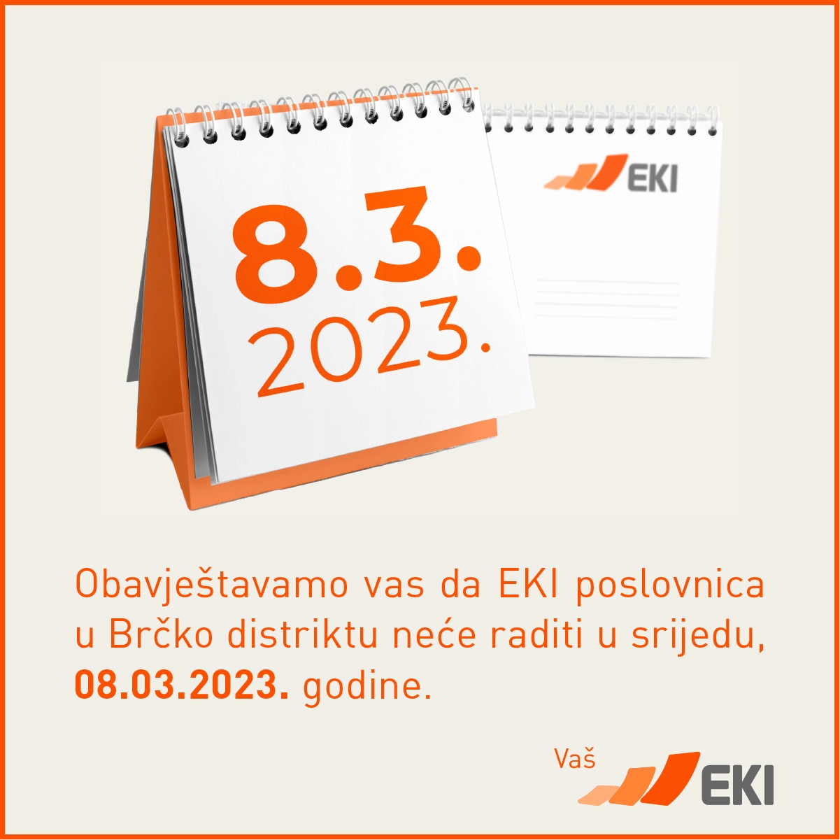 Obavještavamo vas da EKI poslovnice u Brčko distriktu neće raditi u srijedu, 08.03.2023. godine.