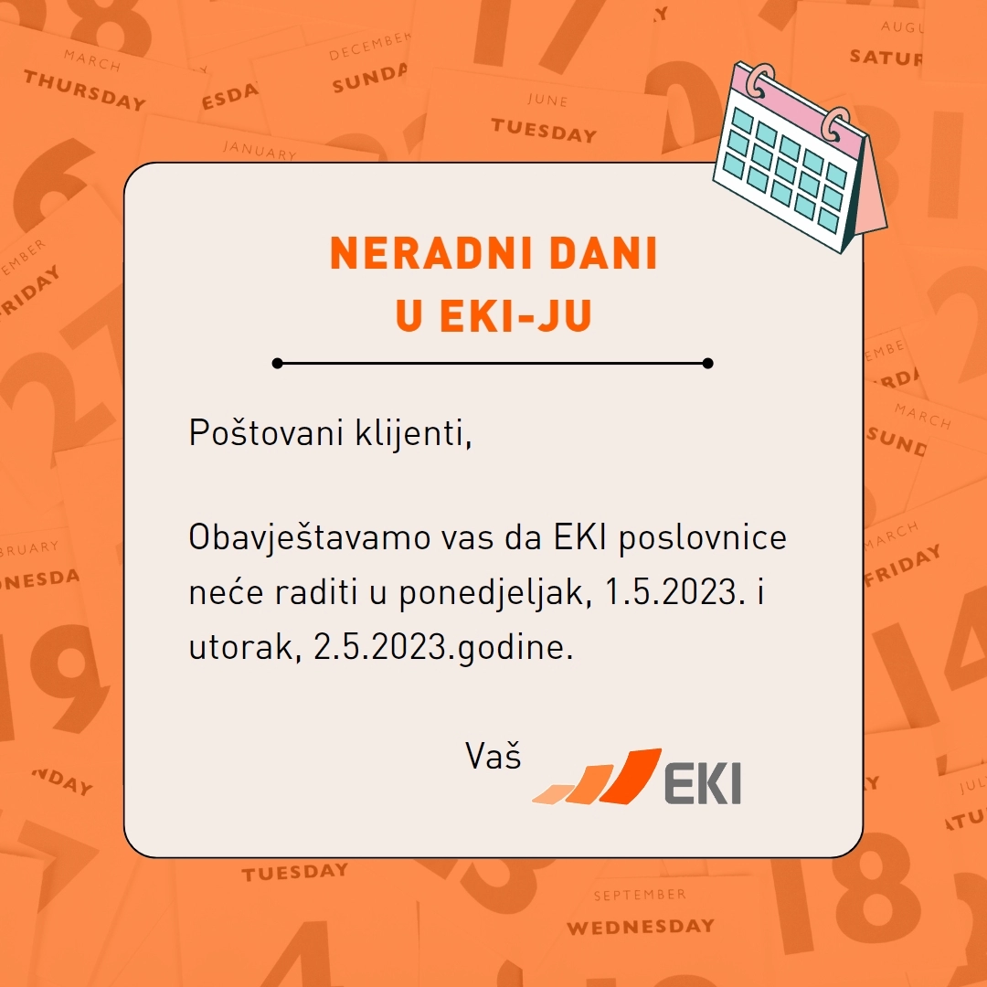 Obavještavamo vas da EKI poslovnice neće raditi u ponedjeljak, 01.05.2023. i utorak, 02.05.2023. godine.