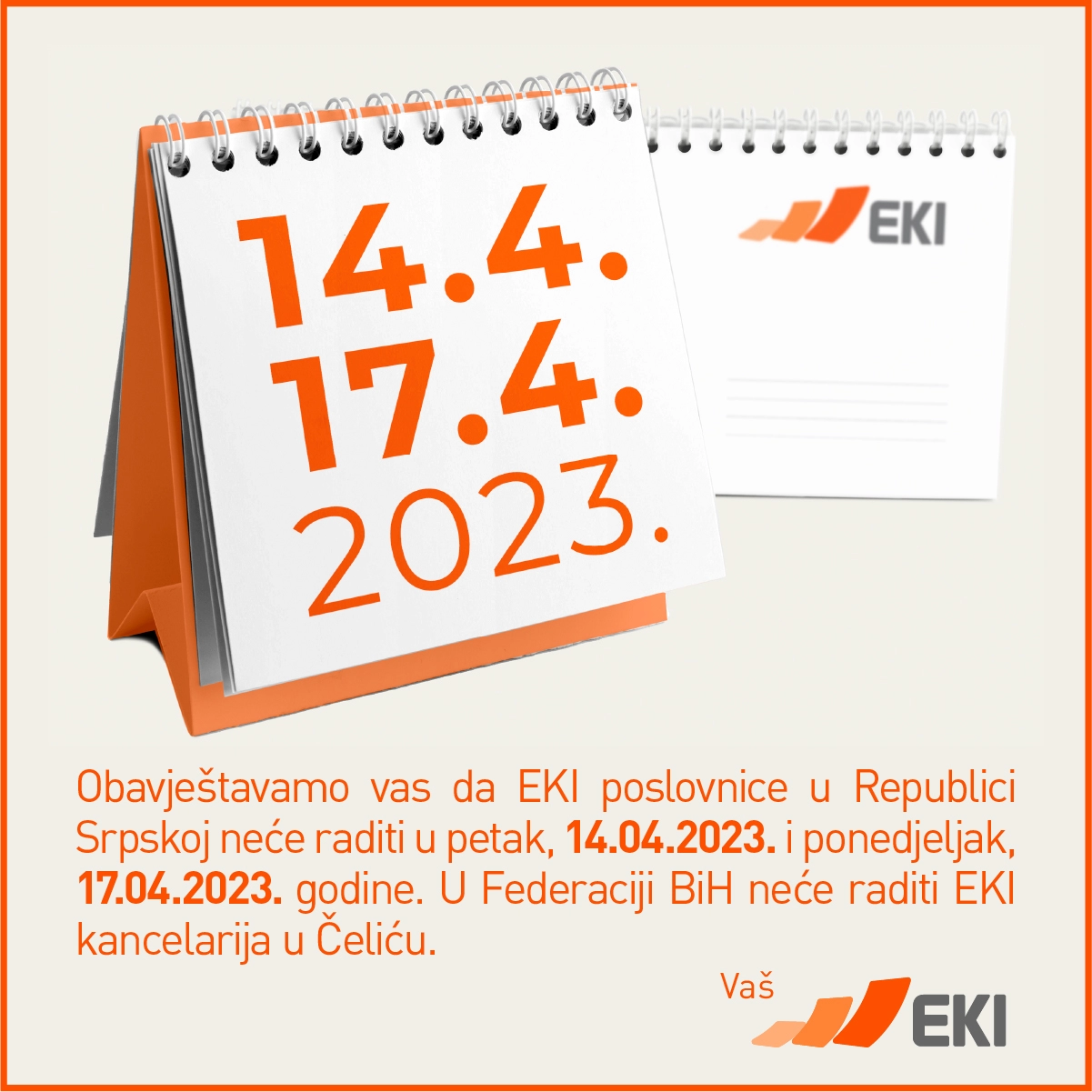 Obavještavamo vas da EKI poslovnice u Republici Srpskoj neće raditi u petak, 14.04.2023. i ponedjeljak, 17.04.2023. godine.